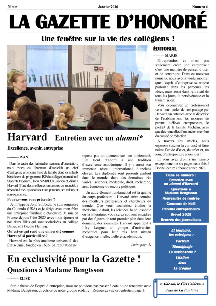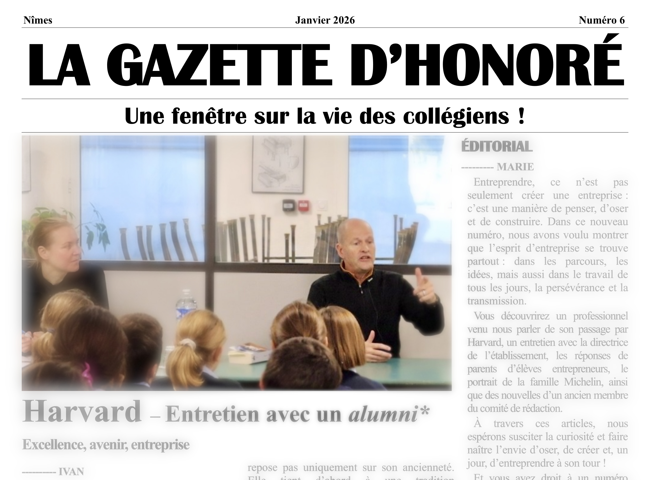 Le nouveau numéro de la Gazette d’Honoré, journal semestriel produit par les élèves du club journalisme, vient de paraître. Ce numéro est spécialement consacré à l’esprit d’entreprise.